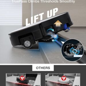 TruePass ระบบไต่ขึ้น 4 ล้อ – ระบบ TruePass ของ DEEBOT X11 ใช้ล้อแบบคันโยกกลไกเพื่อไต่ขึ้นเหนือธรณีประตู ราง และพื้นได้อย่างราบรื่น สูงถึง 0.9 นิ้ว และกว้าง 1.6 นิ้ว โดยไม่ต้องใช้ AI หรือการสแกนล่วงหน้า เพลิดเพลินกับการทำความสะอาดบ้านอย่างราบรื่นไร้สะดุด