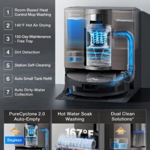ฐานขนาดกะทัดรัด ครบครันในหนึ่งเดียว – ทำความสะอาดได้อย่างง่ายดาย ไม่ต้องบำรุงรักษา – สถานีเติมน้ำยาอัตโนมัติ ล้างด้วยน้ำร้อน จ่ายน้ำยา ทำความสะอาดตัวเอง และเป่าแห้งด้วยลมร้อน 145°F ทั้งหมดนี้ในดีไซน์กะทัดรัดเพื่อความสะดวกสบายสูงสุด